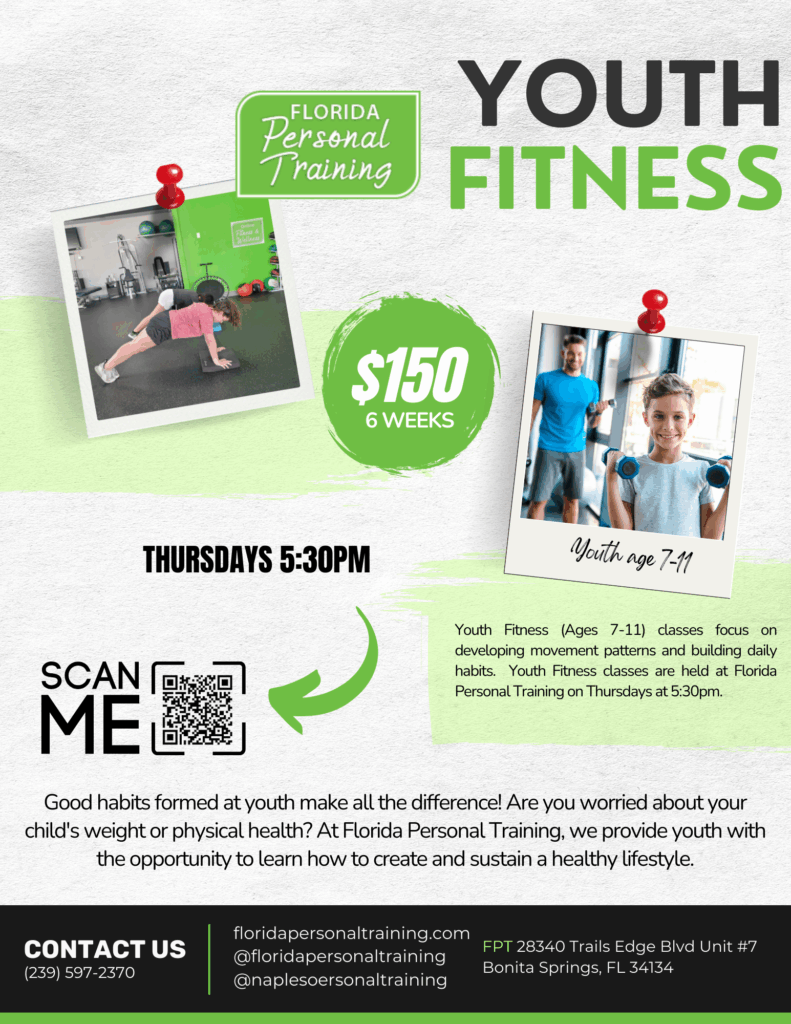 Are you worried about your child’s physical health? At Florida Personal Training, we provide children with the opportunity to learn how to have a healthy lifestyle. Our Youth Fitness program promotes physical fitness and nutritional education in a safe and fun environment. The team of experienced sports performance specialists, physical therapists, athletic trainers, and wellness coaches have the training and expertise necessary to help young kids achieve their health and fitness goals.